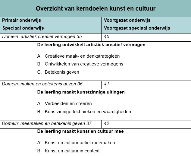 De kerndoelen kunst en cultuur zijn opgedeeld in drie samenhangende domeinen die elkaar versterken: